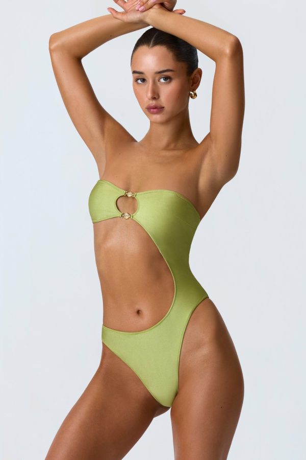 Master resort dressing. The perfect one-piece for beach club or beach days that turn into balmy evenings, this bandeau swimsuit is crafted from premium stretch-jersey swim fabric that sculpts and shapes your figure. It’s punctuated with a curved side cut-out and small bust cut-out, anchored with signature gold-tone shell hardware for a statement finish.
