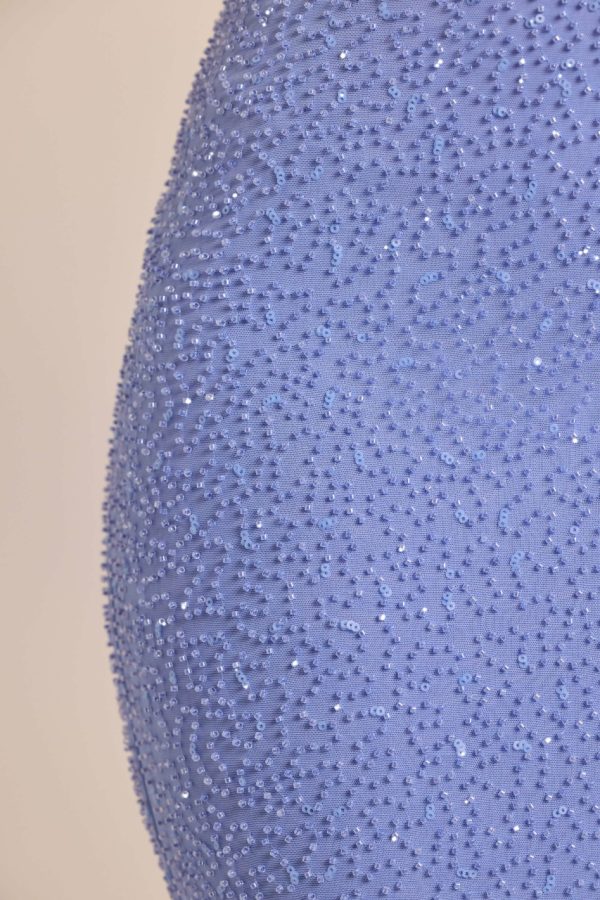 Dual layered mesh fabric with fully seeded embellishment throughout (Shell: 84% Polyester, 16% Elastane, Lining: 95% Polyester, 5% Elastane). Fully lined. This garment contains delicate artisanal hand embellishment and it is normal that overtime embellishment may become loose. Additional embellishment has been provided for repairs.