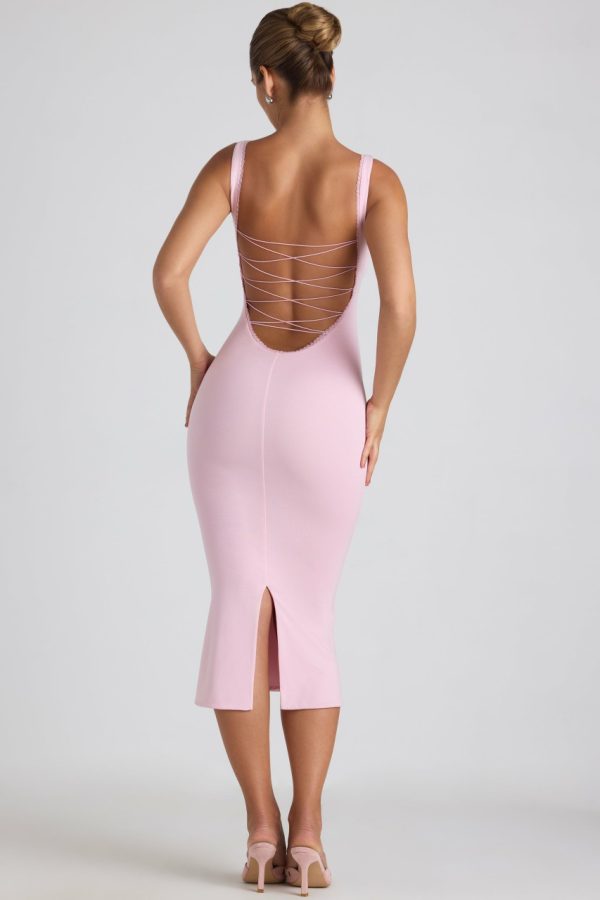 A wardrobe staple with a romantic twist. Available in three versatile hues, the Navi midaxi dress is crafted from buttery soft jersey made with TENCEL™ Modal – a fibre mainly manufactured from renewable beechwood, sourced from sustainable forests. It’s cut to a figure-enhancing bodycon fit with a fishtail hem, and features a round lace-trim neckline and sultry V-shaped low back with signature lace-up detailing.