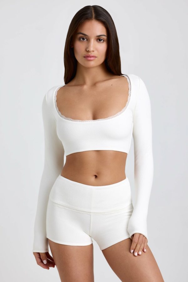 The Calla crop top is a coquette-inspired twist on a classic everyday staple. Made from our dual-layered stretch-ribbed fabric with TENCEL™ Modal fibres that feel twice as soft as cotton, it’s shaped to a curved silhouette and features a scoop neckline traced with tonal picot lace trims, echoing the collection’s whimsical vibe.